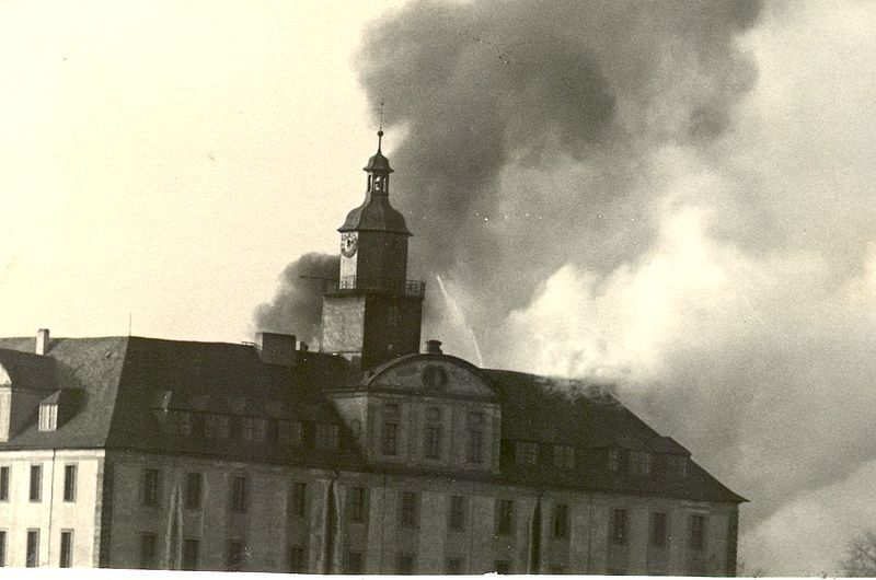 Am 17. Dezember 1953 entfachte im Dachstuhl des Schlosses ein Brand. Die Volkswacht (ehemalige Tageszeitung der SED) schrieb dazu am 29. Dezember 1953: