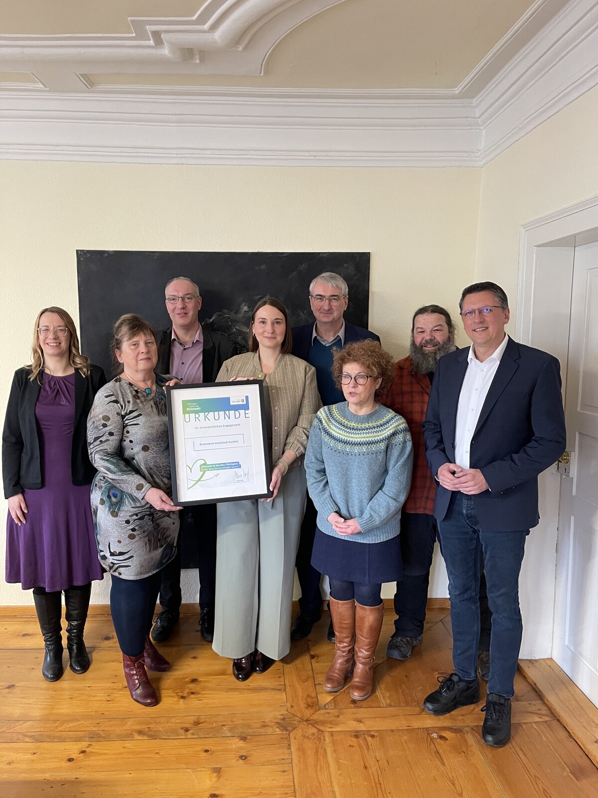 In der Suptur des Kirchenkreises Rudolstadt-Saalfeld übergab Schenk 6.000 Euro für die Ausgestaltung des Ehrenamtstages am 17. Oktober an die amtierende Superintendentin Ina Winter, Christiane Linke, Präses der Kreissynode, den zweiten stellvertretenden Superintendenten Christian Göpke, Gemeindepädagogin Marion Weidner und Kreisjugendreferent Mario Wöckel vom Pfarrbereich Drognitz. „Es ist wichtig, die Ehrenamtlichen im Kirchenkreis zu sehen und zu würdigen“, betonte Christiane Linke. Dazu diene der jährliche Ehrenamtstag, an dem ein gemeinsamer Ausflug mit Programm organisiert wird. In diesem Jahr geht es nach Annaberg-Buchholz ins Erzgebirge. „Mit der Ehrenamtsförderung wollen wir Ihnen den Rücken stärken“, so die Ministerin.