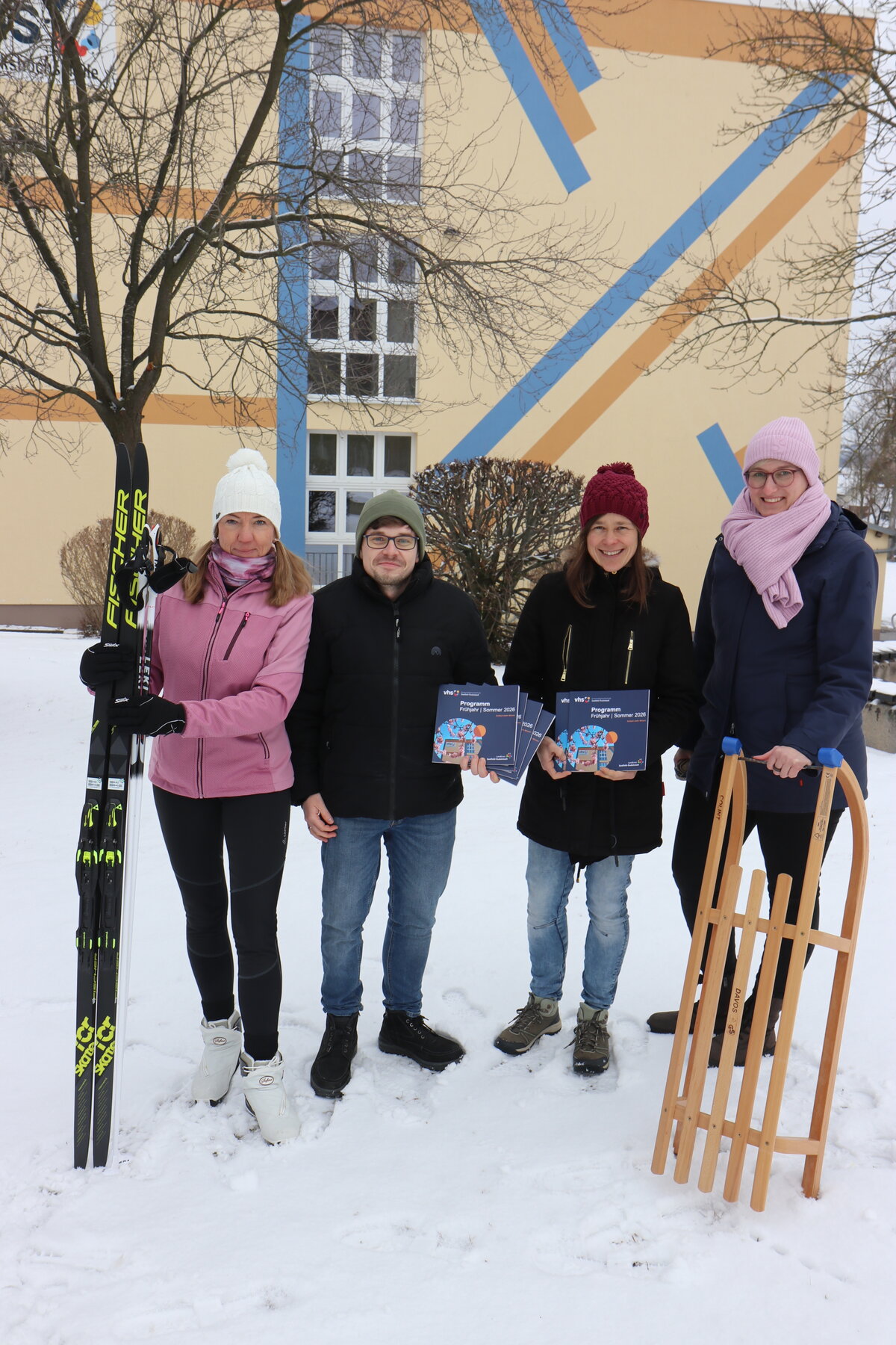 Foto: Das Fachbereichsleiter-Team von der KVHS vor dem Gebäude in winterlicher Landschaft,