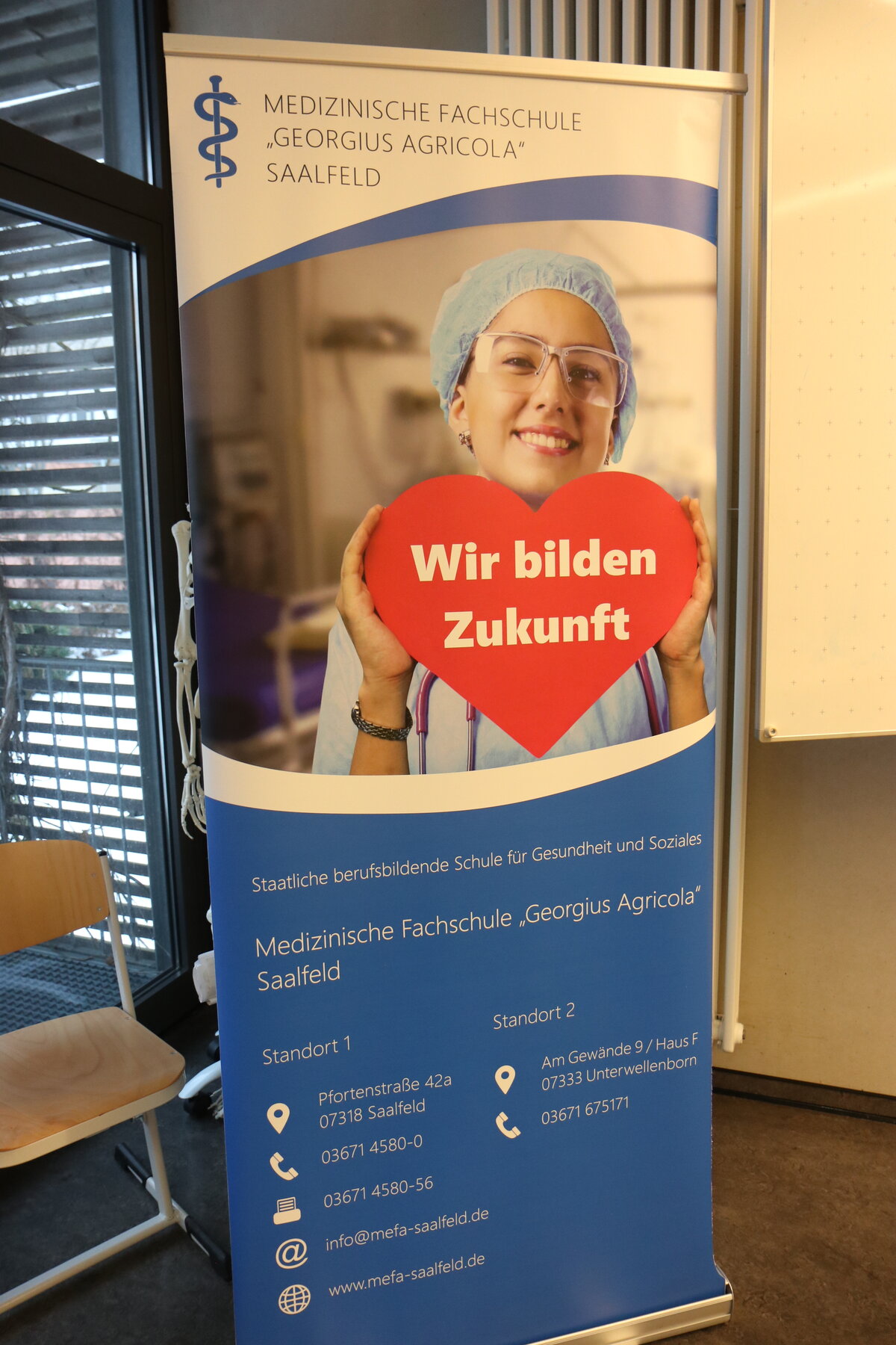 In der Mefa stellte Carmen Frey den Gästen zunächst das aktuelle Schulkonzept vor, ehe sie Dr. Althaus das Gebäude bei einem Rundgang präsentierte. Frey ist seit 2022 Schulleiterin an den Staatlichen Berufsbildende Schule für Gesundheit und Soziales - Medizinische Fachschule Saalfeld „Georgius Agricola“, die sich in Trägerschaft des Landkreises Saalfeld-Rudolstadt befindet und 1974 gegründet wurde. Den Namen Georgius Agricola trägt die Schule seit 1999, das hatte sich durch die enge Kooperation mit den Thüringen-Kliniken ergeben.